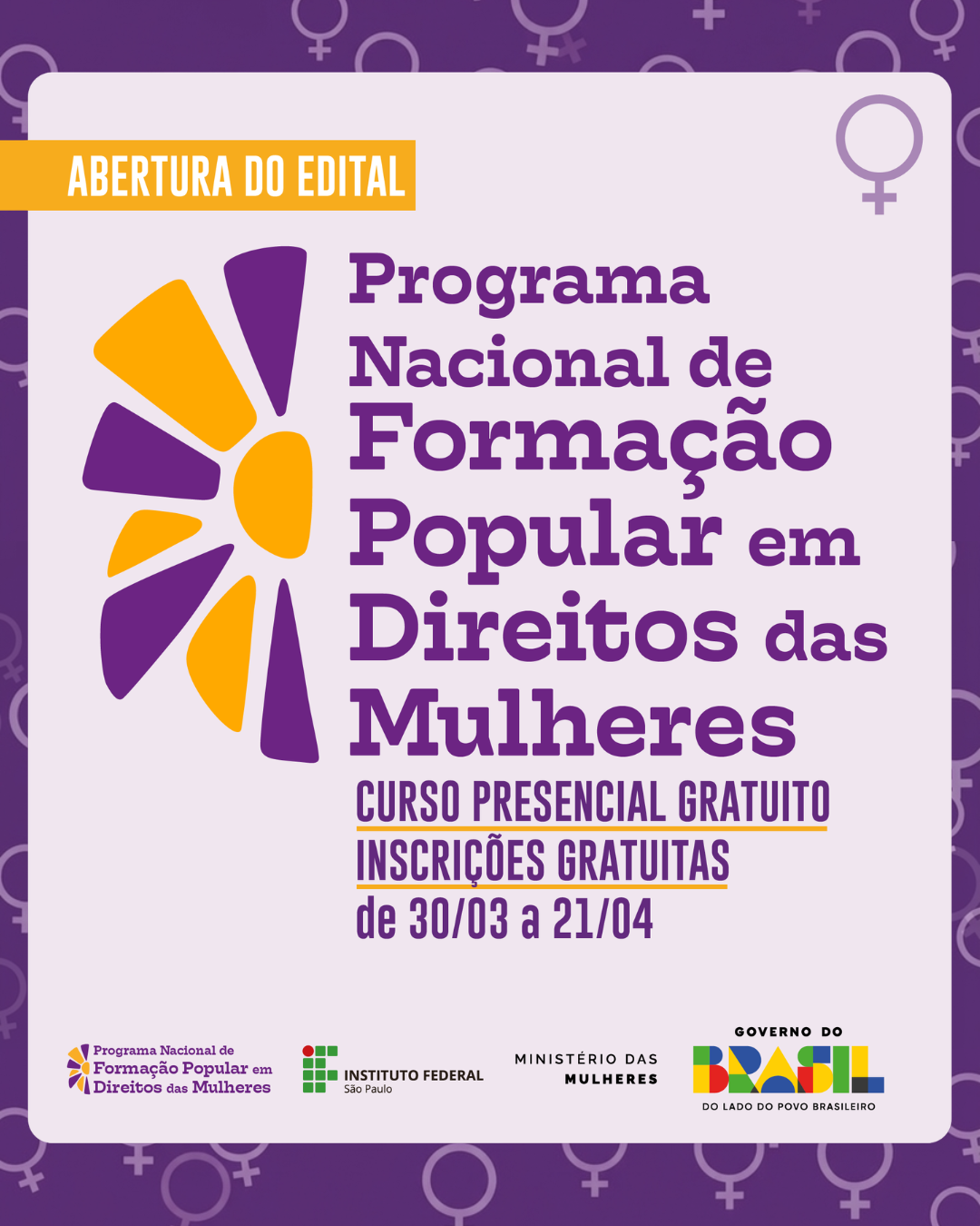 Estão abertas as inscrições para o curso de Formação Popular em Direitos das Mulheres, que faz parte do projeto “Formação e Ação Regional pelo Fim da Violência contra as Mulheres”, alinhado à Política Nacional de Enfrentamento à Violência contra as Mulheres, com recurso proveniente do Ministério das Mulheres e gerenciado pelo Instituto Federal de Educação, Ciência e Tecnologia de São Paulo (IFSP), Campus Hortolândia, e pela Fundação de Apoio Institucional ao Desenvolvimento Científico e Tecnológico (FAI.UFSCar).